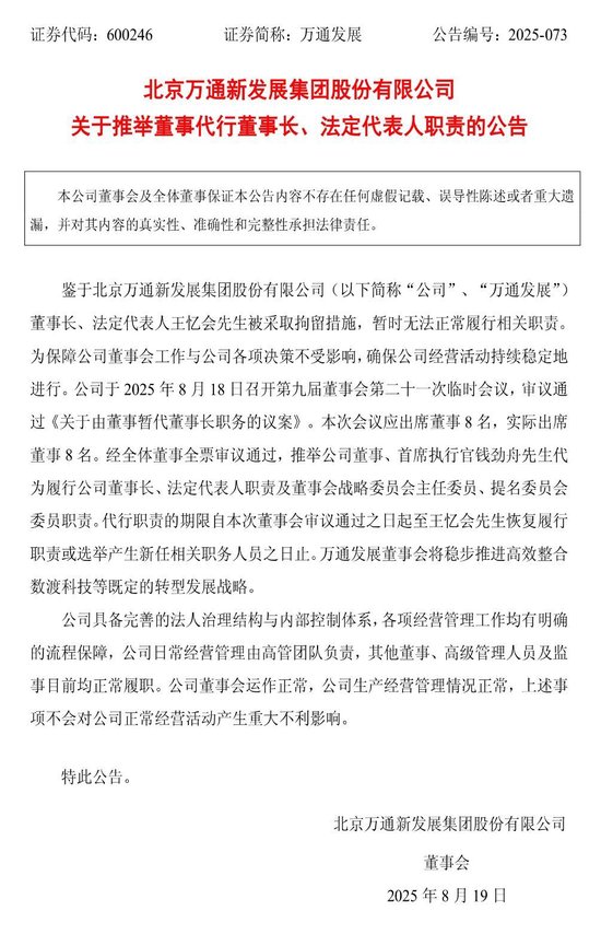 8月18日晚间,万通发展(维权)(600246.SH)发布公告,公司实际控制人、董事长王忆会被采取拘留措施。