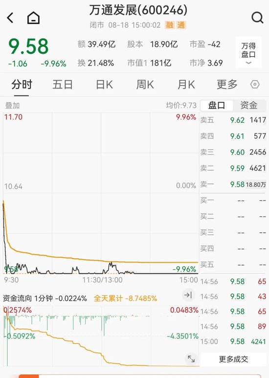 8月18日,万通发展开盘跳水,迅速触及跌停板融创配资,上午始终徘徊在跌停线附近。截至收盘,万通发展报 9.58元 /股,跌幅为 9.96% ,当前总市值为181亿元。