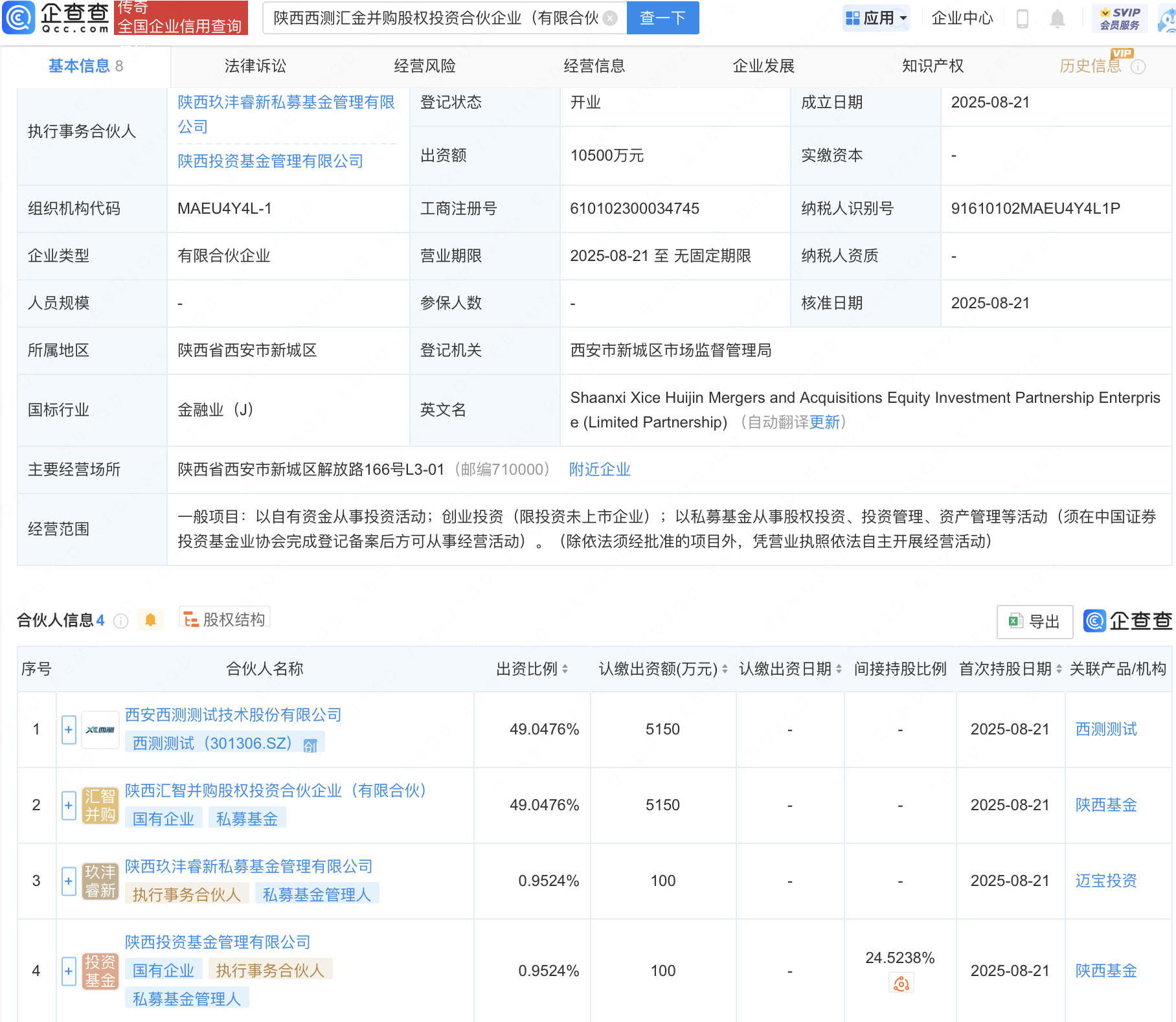 近日股涨柜,陕西西测汇金并购股权投资合伙企业(有限合伙)成立,出资额1.05亿元,经营范围包含:以自有资金从事投资活动;创业投资(限投资未上市企业);以私募基金从事股权投资、投资管理、资产管理等活动。企查查股权穿透显示,该企业由西测测试(301306)等共同出资。